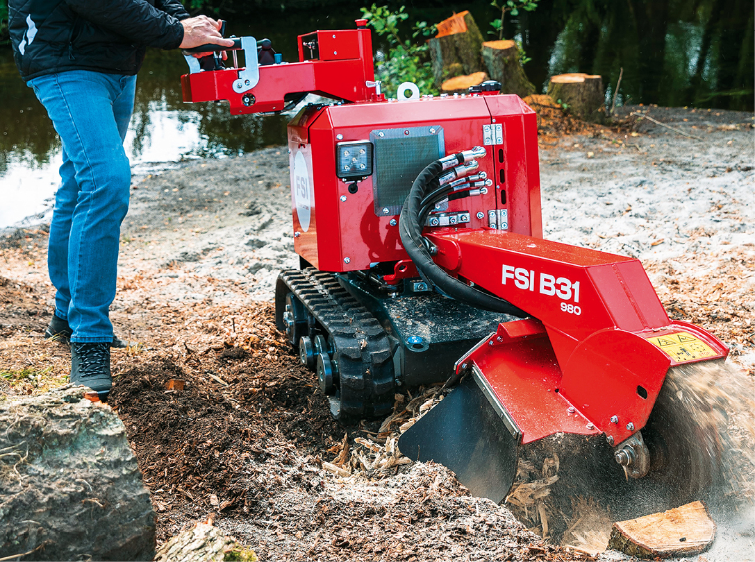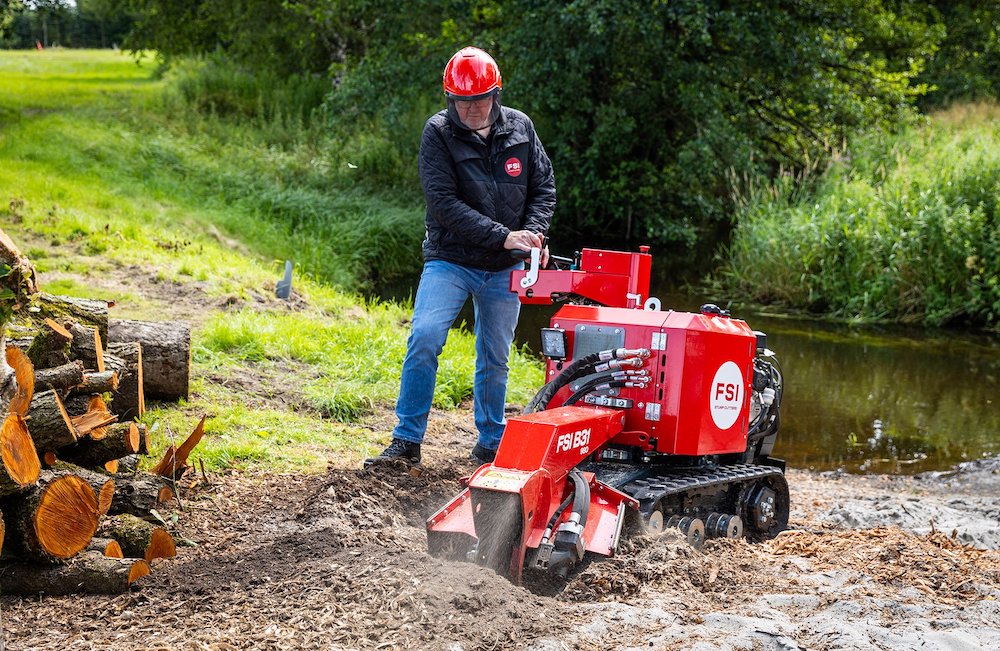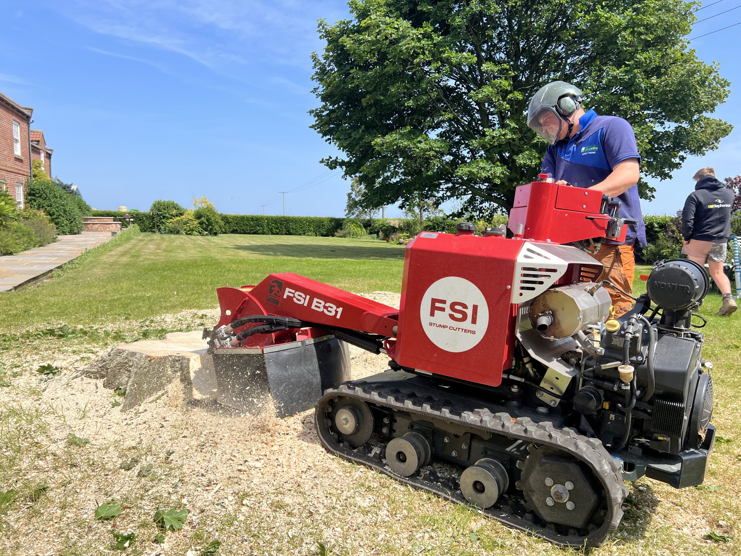 Our tracked grinder (rubber tracks to spread weight) is carefully manoeuvred into place. This helps protect lawns and soft ground, even when conditions are damp.